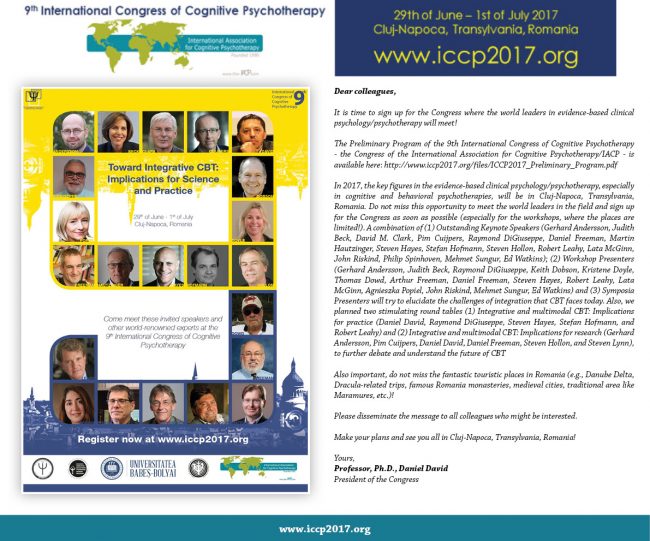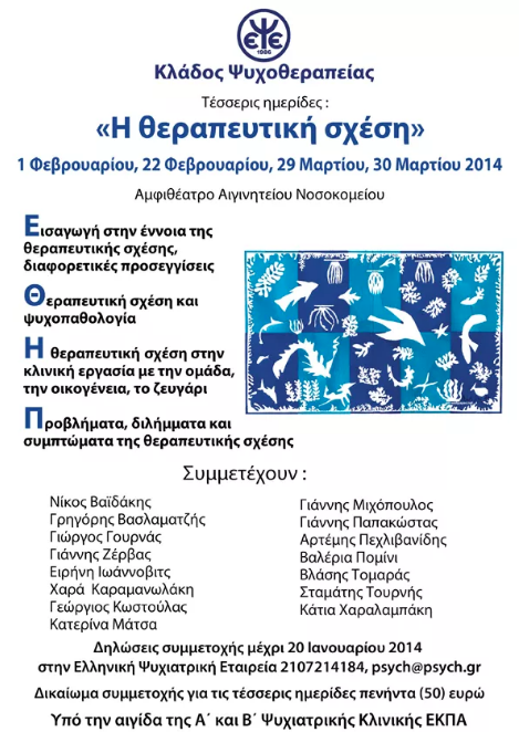 Η Ελληνική Εταιρεία Γνωσιακών Ψυχοθεραπειών (Ε.Ε.Γ.Ψ.) διοργανώνει το 5ο Πανελλήνιο Συνέδριο Γνωσιακών Ψυχοθεραπειών με θέμα: «Γνωσιακή Ψυχοθεραπεία: Προκλήσεις & Προοπτικές» στο Συνεδριακό Κέντρο του Πανεπιστημίου Πατρών 10-12 Νοεμβρίου 2017, υπό την Αιγίδα της Ε.Α.Β.C.T & της Ελληνικής Ψυχιατρικής Εταιρείας και την επιστημονική συνεργασία του Ινστιτούτου Έρευνας και Θεραπείας της Συμπεριφοράς και της Ελληνικής Εταιρείας Γνωστικής Συμπεριφορικής…